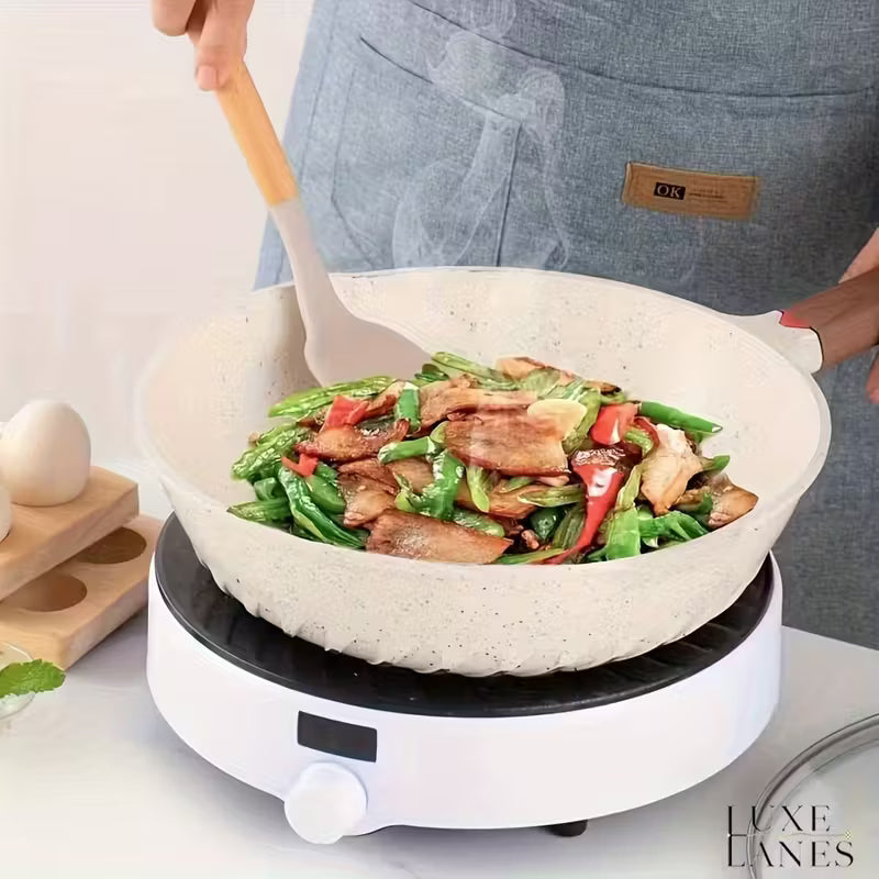 Taip, ergonomiškos medinės rankenos suteikia subalansuotą ir tvirtą laikymą, užtikrinant saugų ir lengvą gaminimą.