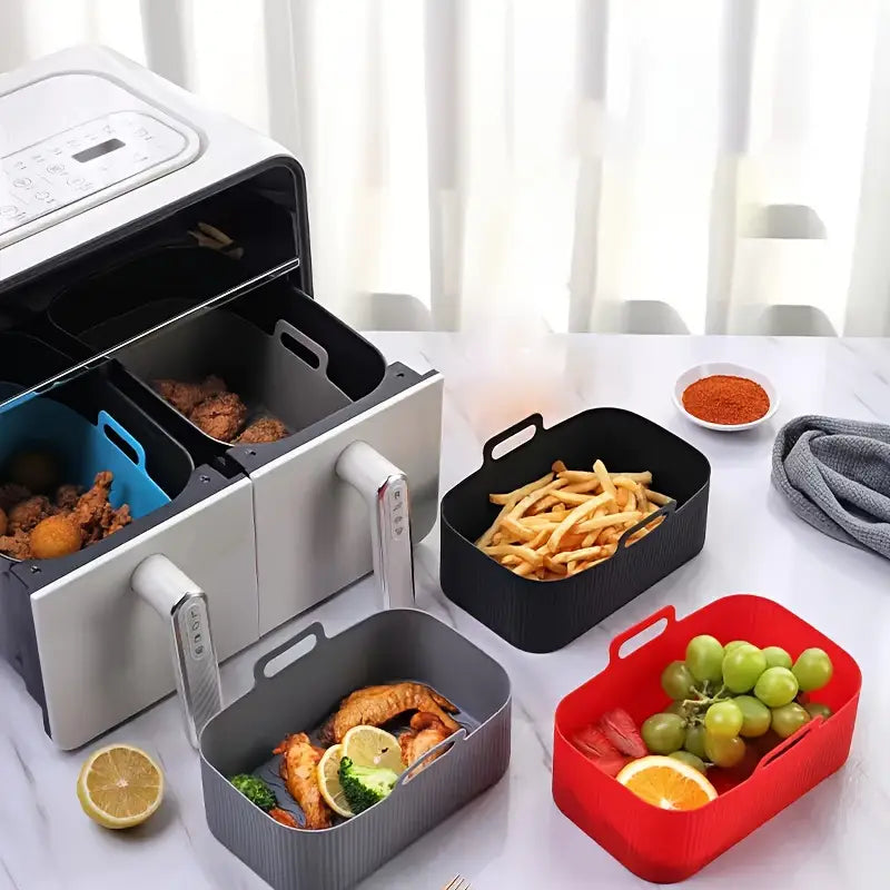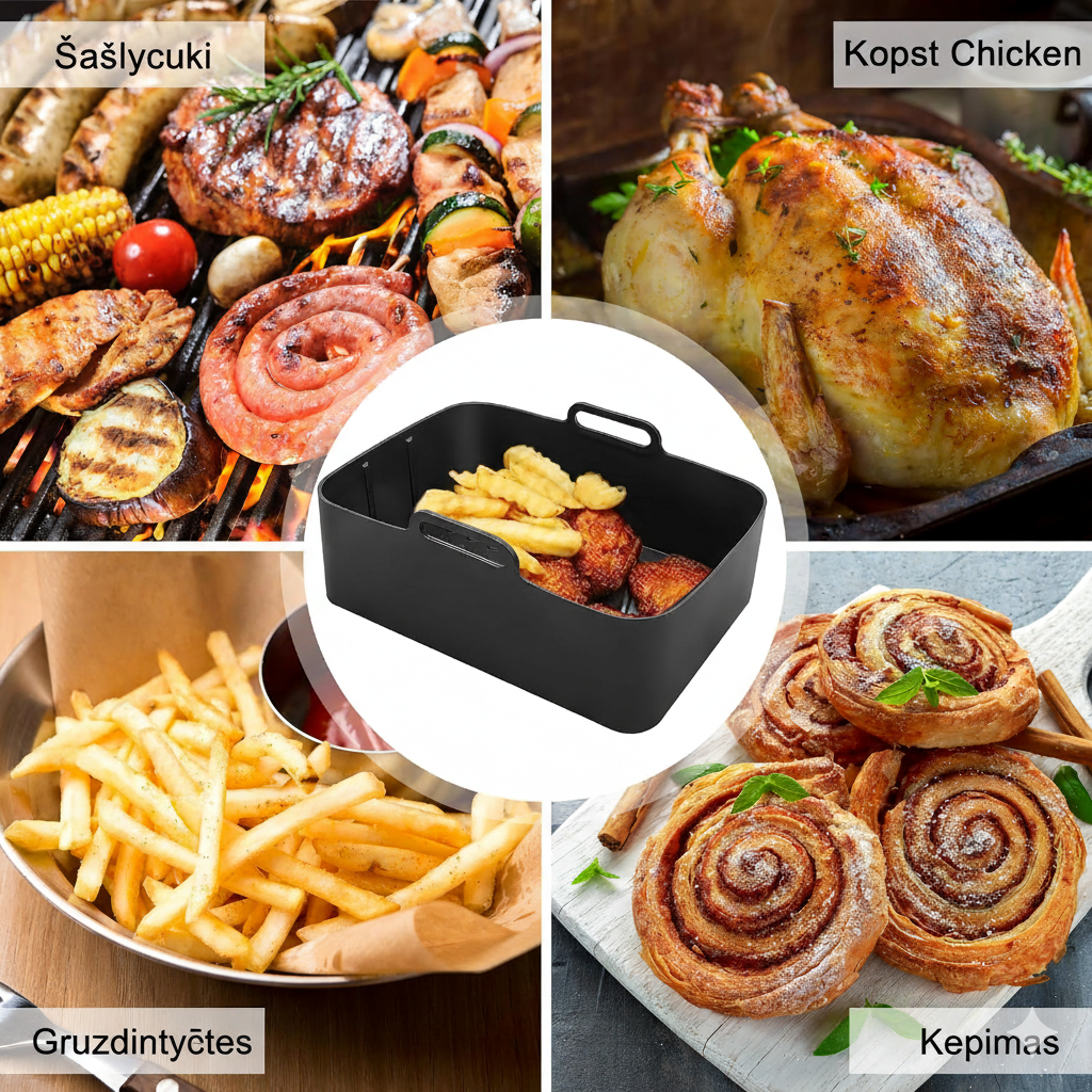 Pavargote nuo riebalų ir prilipusių likučių po kiekvieno gaminimo? Šios silikoninės formelės apsaugo jūsų oro gruzdintuvę nuo maisto likučių, aliejaus sankaupų ir pridegusių trupinių. Lygus ir lankstus paviršius leidžia jas greitai bei lengvai išvalyti – be šveitimo ar grandymo.